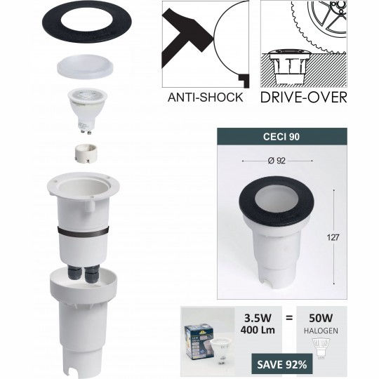 - DRIVE-OVER in-ground svetiljke bez vidljivih vijaka, napravljene od materijala otpornog na udarce, UV-zraka stabilizovanih, rđe i bez korozije.